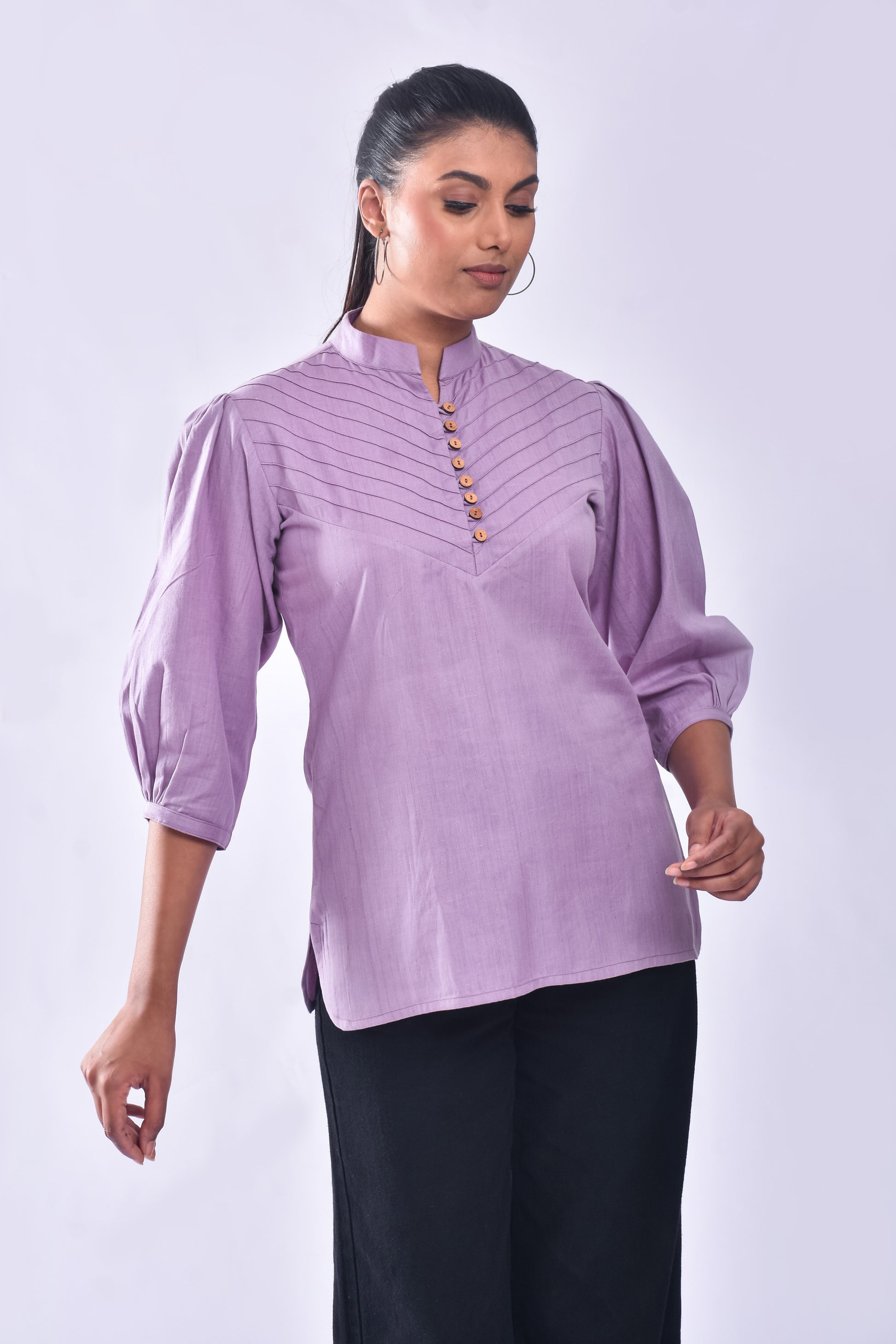 Embrace the relaxed vibes with this casual lilac shirt adorned with pintucks, wooden buttons, and a stylish stand collar.